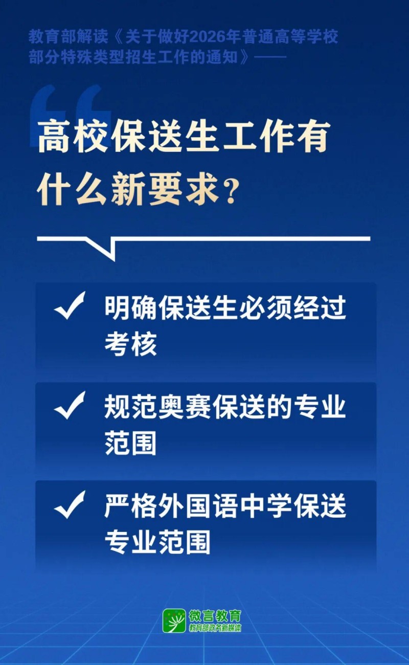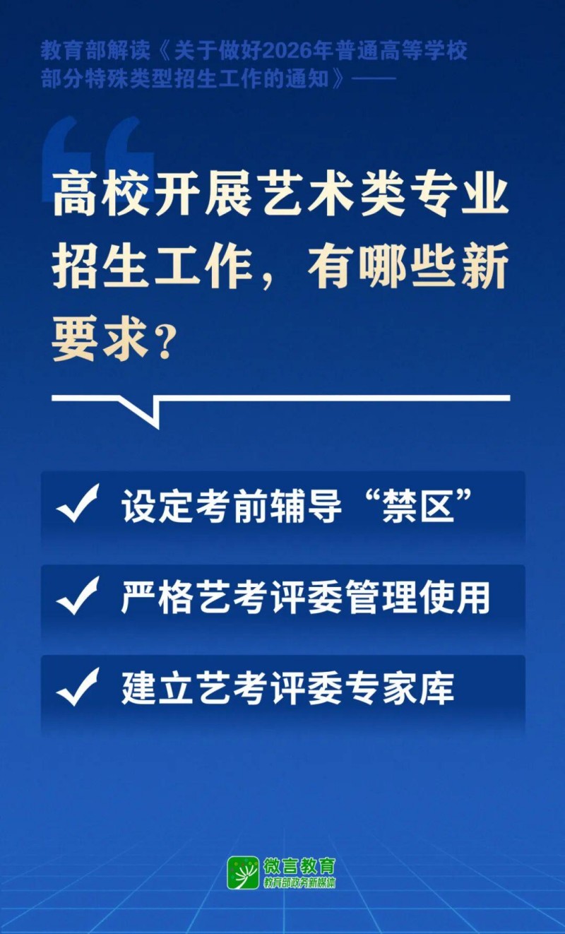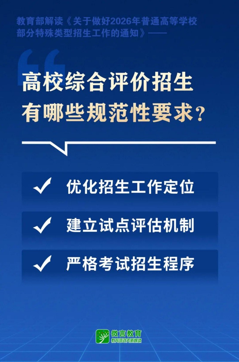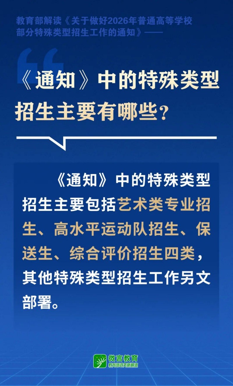 日前,教育部印发《关于做好2026年普通高等学校部分特殊类型招生工作的通知》(以下简称《通知》)。特殊类型招生主要有哪些?又有哪些新要求?一起来看——