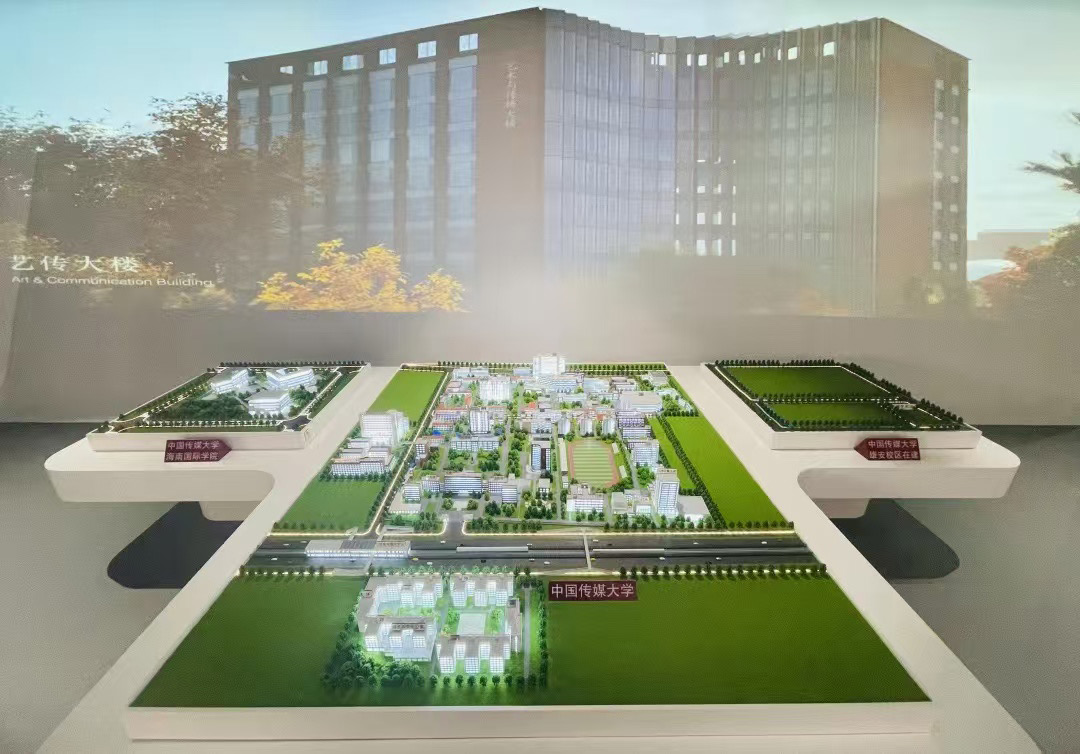 2024年校史馆的新沙盘展示了中国传媒大学、海南国际学院、雄安校区“一体两翼”的新格局初步形成