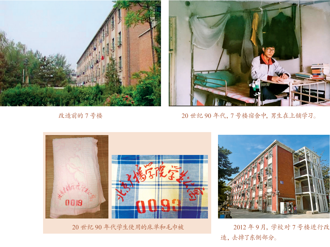 7号楼建成于1978年,原建筑面积3656平方米,共4层。刚盖好的7号楼是筒子楼,为男生宿舍楼。水房和卫生间在楼道里,上厕所要排队,洗澡则要去位于现在体育场西门对面的公共浴池。虽然条件比较简陋,但是学生宿舍楼第一次有了传达室,并配备了公用电话。