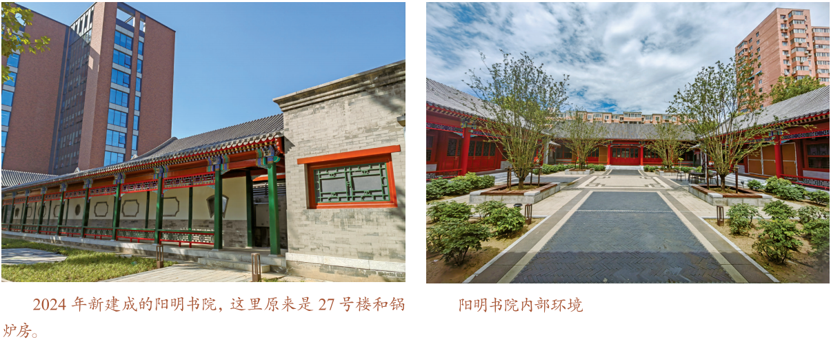 2024年,一座古朴典雅的四合院“阳明书院”在27、28号楼的位置落成。书院为两进式四合院,南北长52米,东西宽44米,建筑面积1173平方米。书院及地下工程为钢筋混凝土框架结构。建筑风格融入中国传统建筑元素,层次丰富、步移景异,展现了深厚的文化底蕴,彰显了传统文化的独特魅力。书院内设“阳明讲堂”和“国际会客厅”,学校人类命运共同体研究院、阳明书院、国际交流与合作处、教育基金会秘书处入驻办公。“阳明讲堂”作为通识教育基地,将传统“书院制”教育与现代通识教育有机融合,为广大学子提供了深度学习国学经典、沉浸式体验传统文化的平台;“国际会客厅”作为学校对外交流与合作中心,为国际交流活动提供了独具特色的新空间。