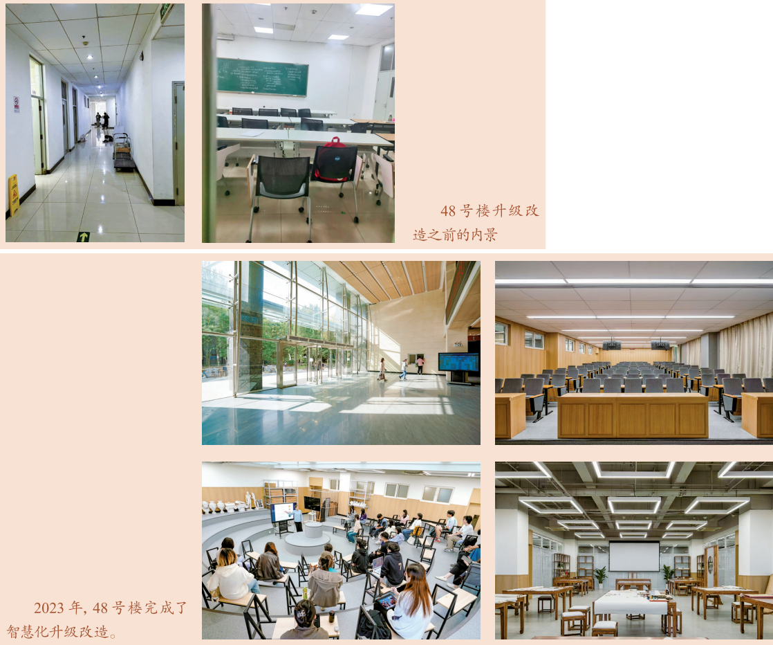 2023年,为满足数字化教学需求,创造更加智能的教学环境,经历109天,在学校校园建设处、实验室与设备管理处等多部门的通力协作下,48号楼完成了智慧化升级改造。2023年9月26日,48号楼改造工程正式通过验收并交付使用,改造面积约2.8万平方米,深度融合“中传云”,构建了信息化、智能化、多元化的教学新空间,全面提升了智慧校园建设水平。