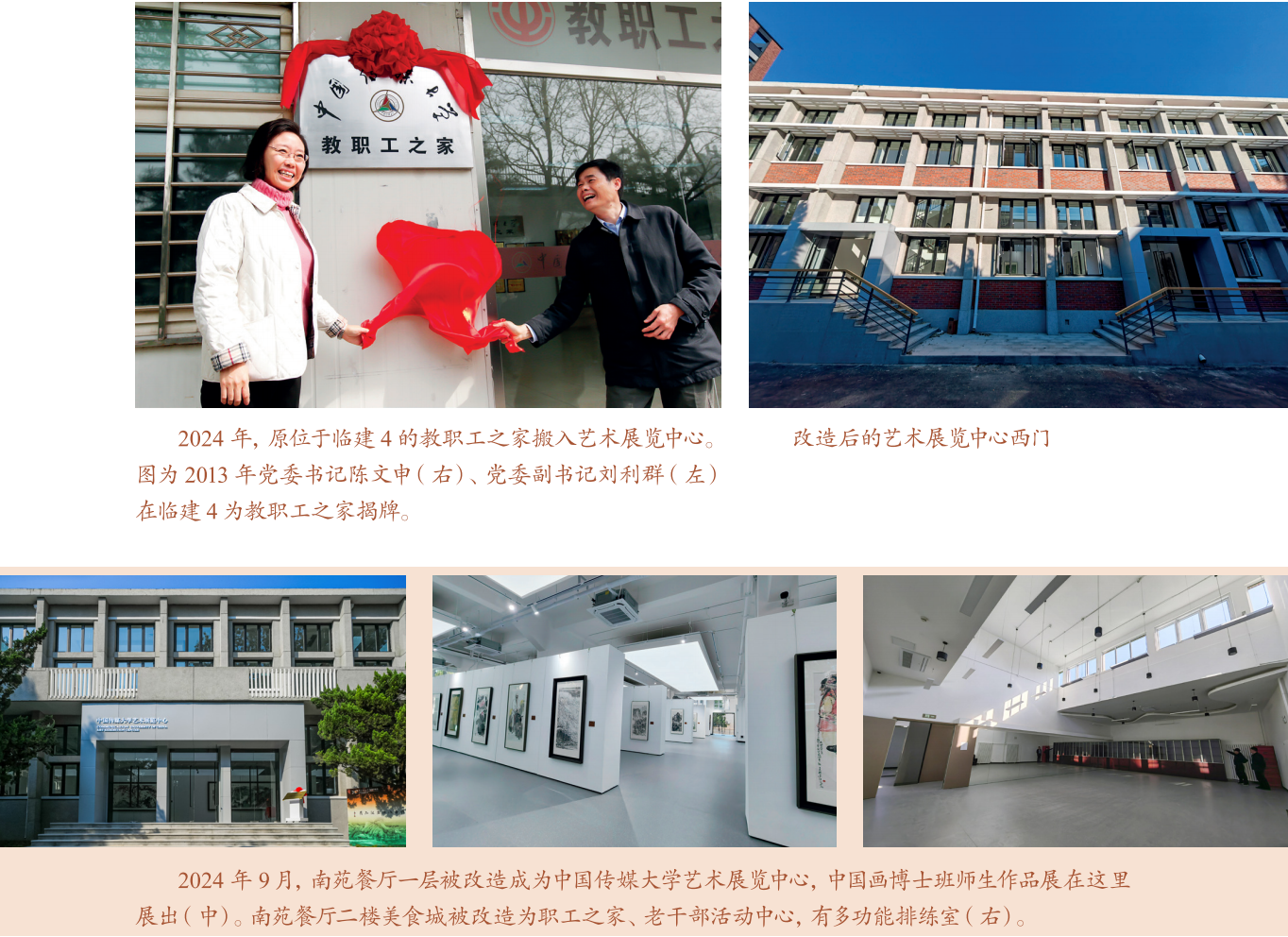 2024年,中传美食广场的建成释放了南苑餐厅2400平方米的空间。学校调整空间功能布局,对南苑餐厅外立面进行了改造,将这座餐厅建筑改造为集艺术展示与活动交流功能于一体的艺术展览中心,对原建筑内部布局进行了整体重构。一层空间为艺术展厅、高密度数据中心机房和网络机房,二层空间为职工之家、老干部活动中心以及学校工会和离退休工作处的办公区,还设置了学习室、智慧教室和多功能排练室以及乒乓球、沙壶、棋牌等休闲活动区域。艺术展览中心丰富了教职工的业余生活,提高了教职工的凝聚力和归属感,成为教职工文化交流的新场所,提升了校园文化品位。