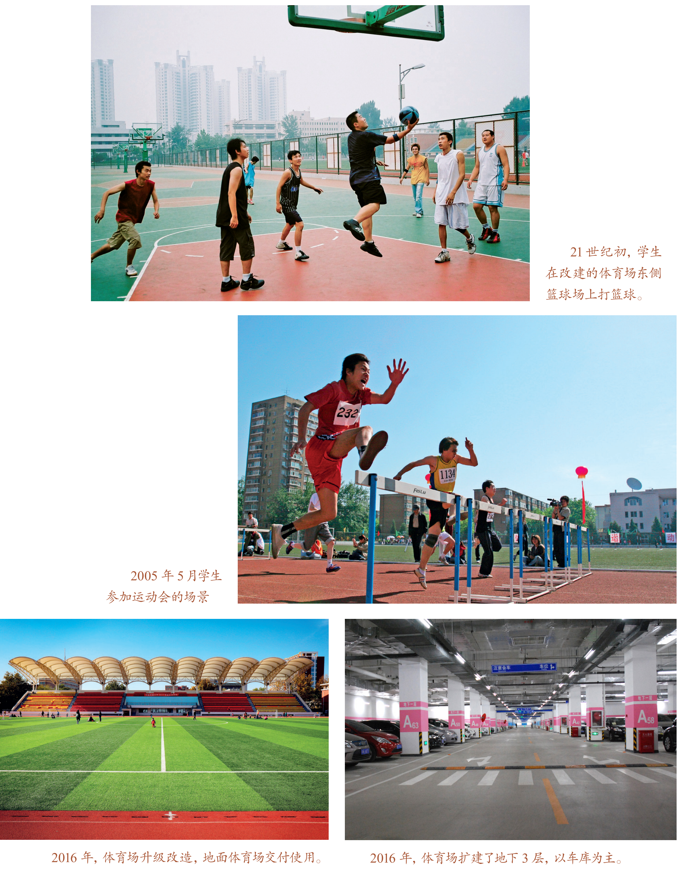 2016年4月,体育场升级改造,地面体育场交付使用。体育场扩建了地下3层,地上为田径体育场和足球场地等,地下建设成以地下车库为主(可容纳约1400辆车)、音乐舞蹈排练设施及室内体育设施为辅的地下综合体。体育场是学校最主要的室外体育文化生活保障设施,配有高品质标准运动场地,同时地下车库实现了停车入地,优化了地上空间,为后续“无车”校园环境的建立打下了良好的基础。