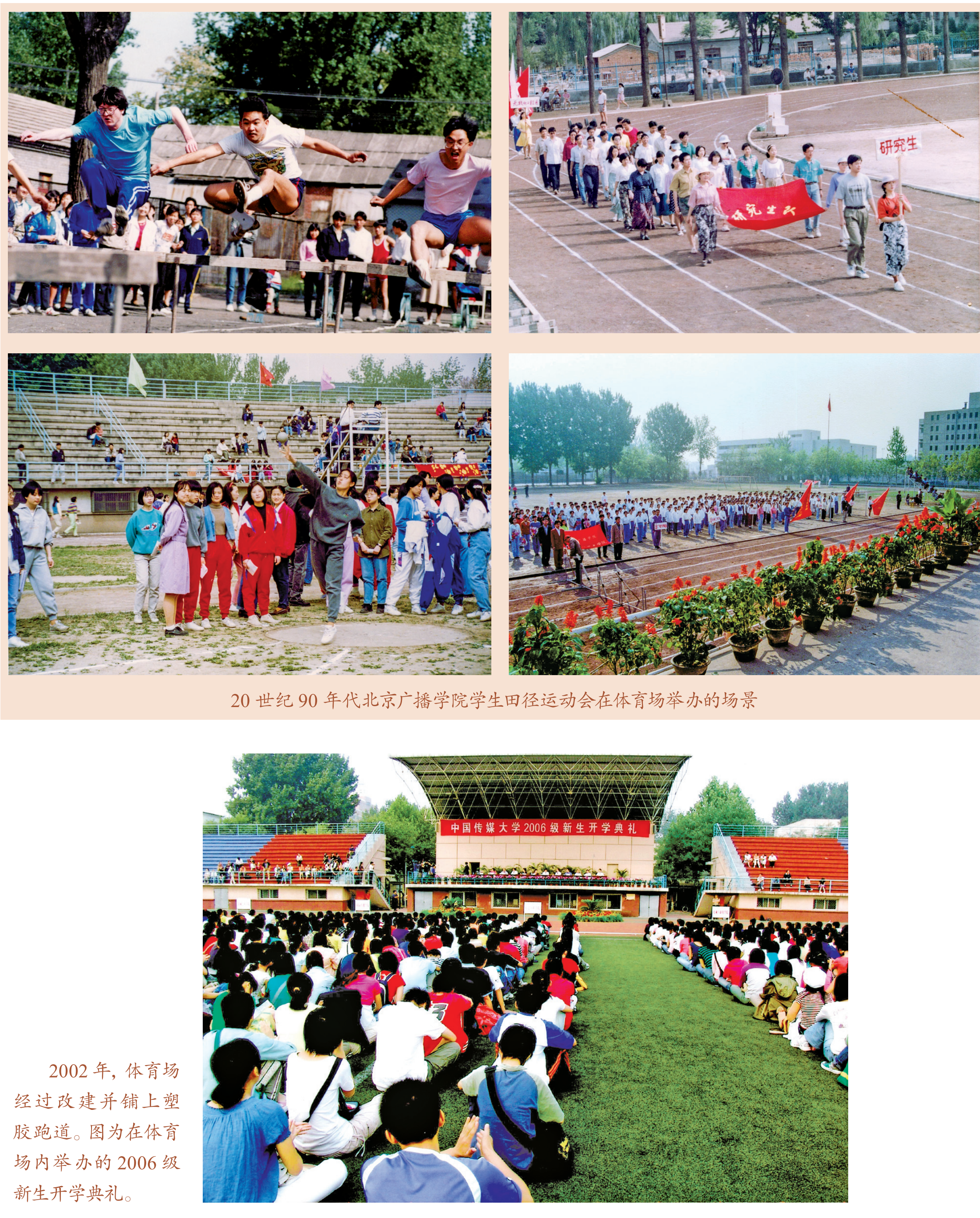 北京广播学院办学初期条件十分艰苦,整个校舍就是一幢5层的“灰楼”,学校的体育场建在“灰楼”房顶上,打排球、踢足球、跑步和跳绳等体育活动都在房顶上进行。搬迁至定福庄后,学校终于有了真正的体育场。